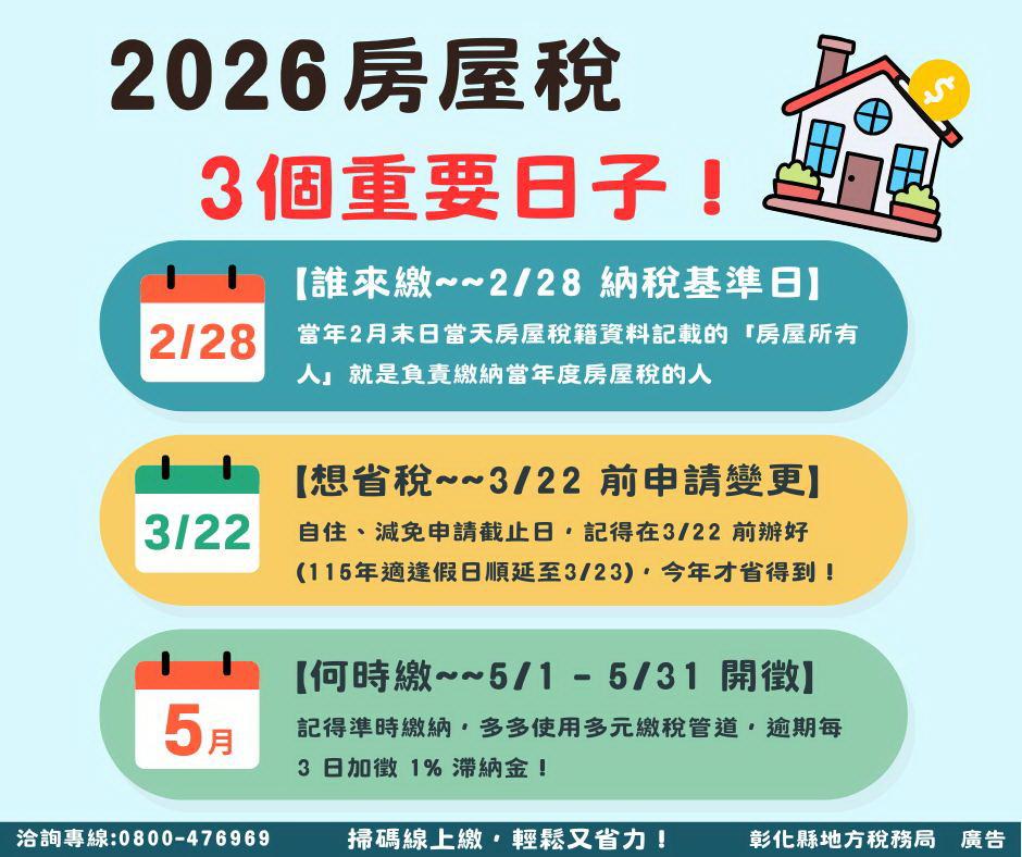 2、符合房屋稅減免條件者,記得於115年3月23日前提出申請,當期即可適用優惠稅率。