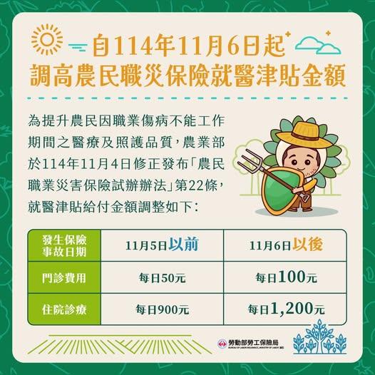 為提升農民因職業傷病不能工作期間之醫療及照護品質,農業部於114年11月4日修正發布「農民職業災害保險試辦辦法」第22條,就醫津貼給付金額調整如下: