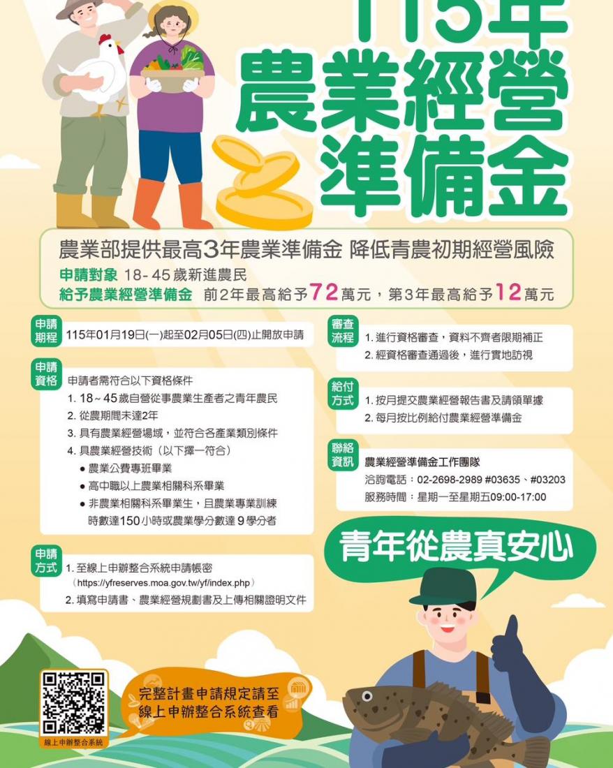 申請注意看這邊申請時間:115年1月19日~2月5日申請對象:18~45歲新進農民申請方式:線上申請補助內容:・前2年最高可領 72 萬元・第3年最高可領 12 萬元 申請方式與詳細規定請至農業經營準備金線上申辦系統查詢:(網址請至留言處)線上說明會:1月23日(五)14:00( 免報名,網址請至留言處)有符合資格的農友,記得把握時間申請喔!——————————————————— 諮詢窗口執行單位:財團法人中國生產力中心 (02)2698-2989 分機 03635、03203#田尾鄉農會 #田尾鄉農會關心您#農業部 #青年農民農業經營準備金 #青年農民 #青年農民補助